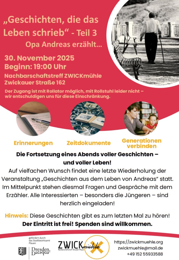 Auf allgemeinen Wunsch gibt es eine Wiederholung von Geschichten aus dem Leben von Andreas M. zu hören. Diesmal in veränderter und verkürzter Form. Alle Interessierten sind herzlich eingeladen.