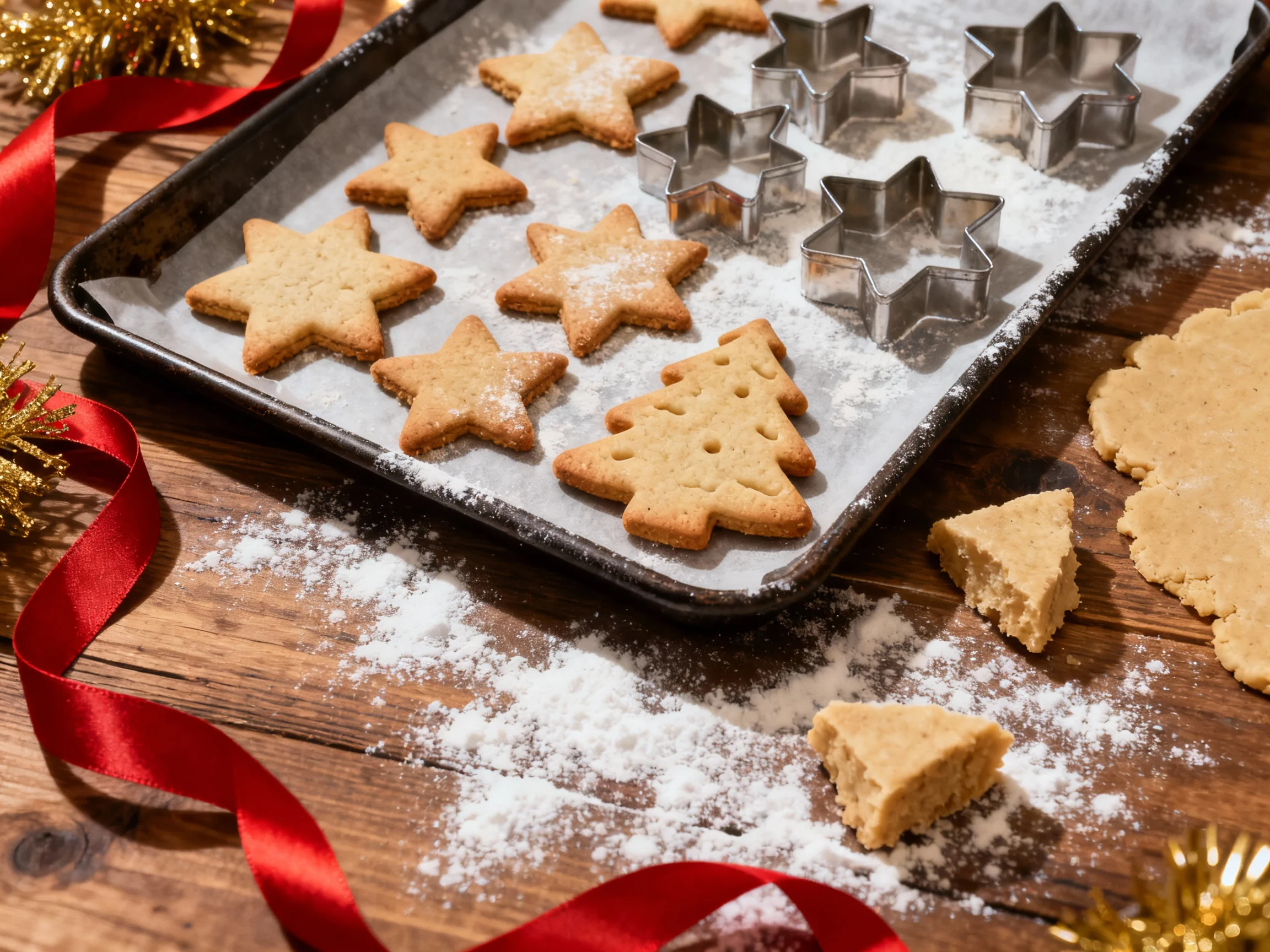 Wir backen gemeinsam ein paar klassische Plätzchen. Bringt etwas Teig, Streusel und Ausstechformen mit.